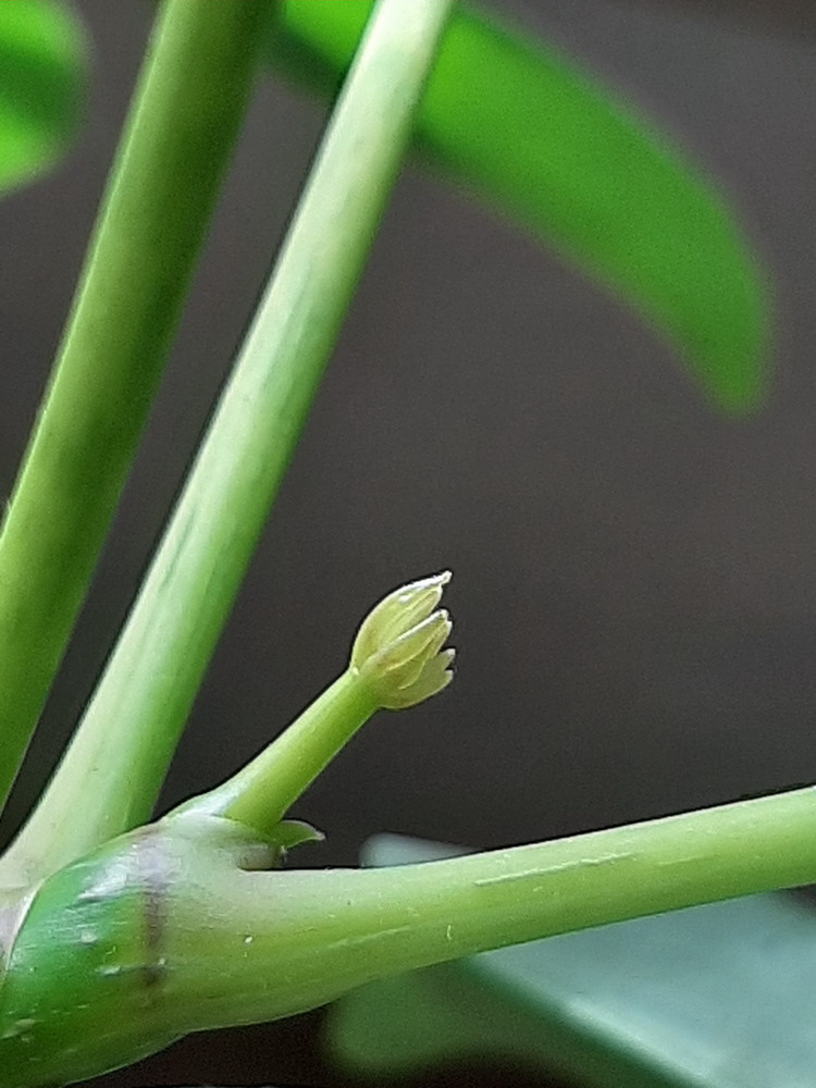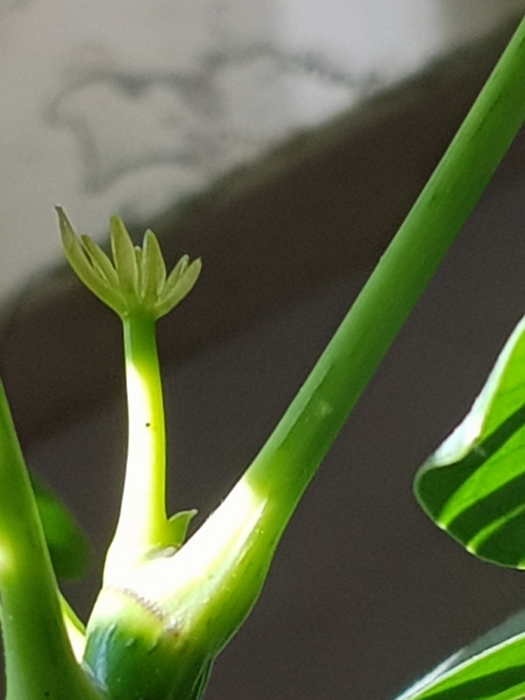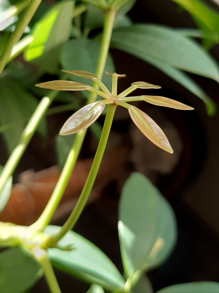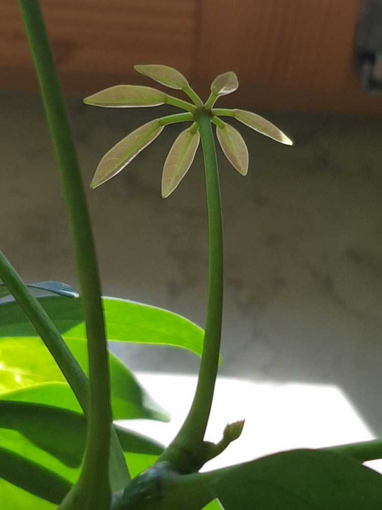 Man muss sich vorstellen, unsere Aralie hat einen dünnen, einen Meter langen Hauptstamm und fünf Äste! An jedem dieser fünf Äste wächst nur jeweils ein neues Blatt, immer abwechselnd an einen anderen Ast. Nie gleichzeitig an zwei verschiedenen Ästen, immer zeitversetzt ein neues Blatt an einem anderen Ast! Dies habe ich im März, zum Anfang des Lockdowns, als wir zwangsweise viel zu Hause sein mussten, beobachtet.