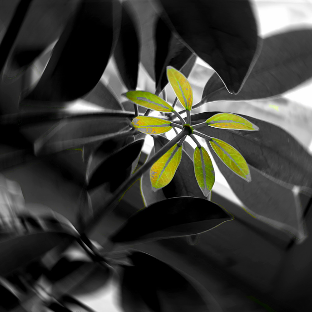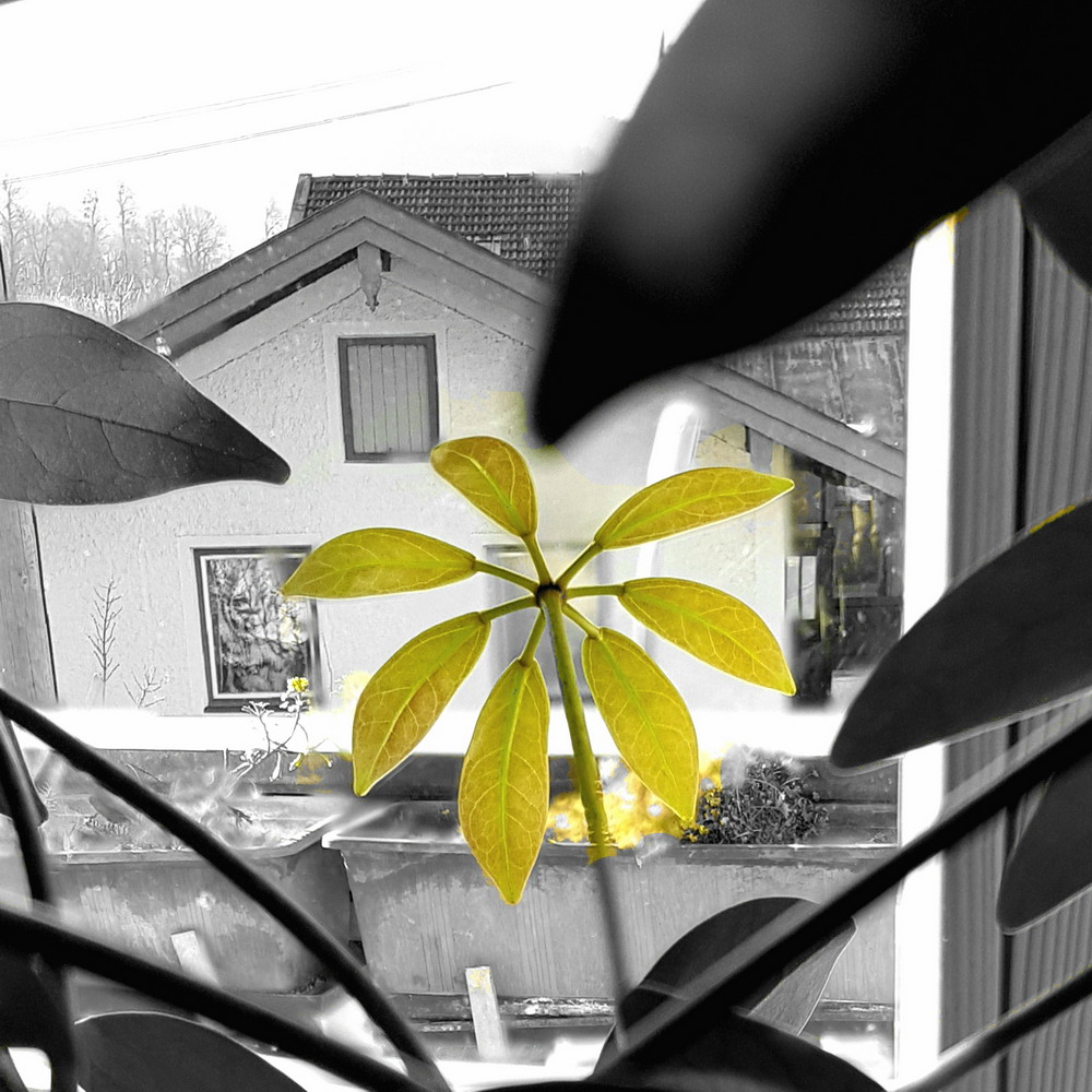 Jeden Morgen nach dem Aufstehen gehe ich vom Schlafzimmer in den Korridor. Dort stehen am Fenster, die an der Südseite liegen, zwei Mitbewohner. Es sind pflanzliche Mitbewohner. Nicht nur Mitbewohner, sondern auch seit über 30 Jahren Freunde von uns. Zwei Bäume in zwei großen Töpfen. Eine Strahlenaralie und eine Birkenfeige. Ich schaue jeden Morgen nach, wie es ihnen geht. Bei meiner Fotoserie handelt es sich um die Strahlenaralie.