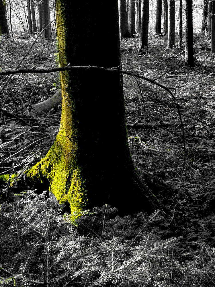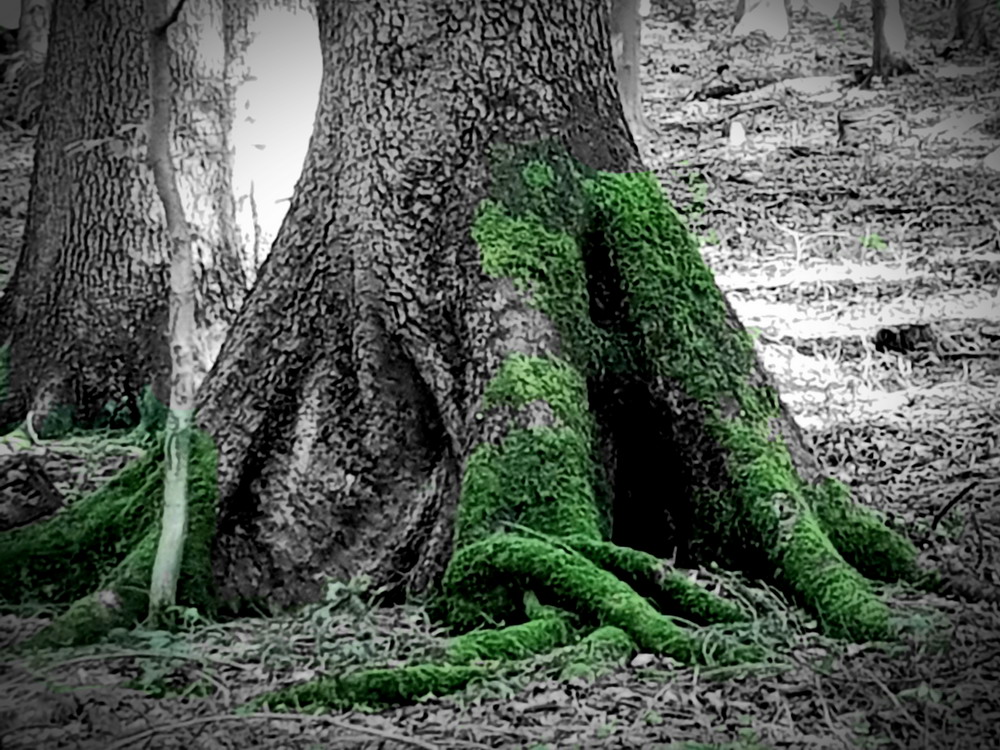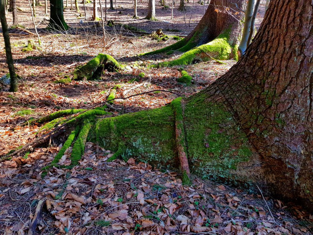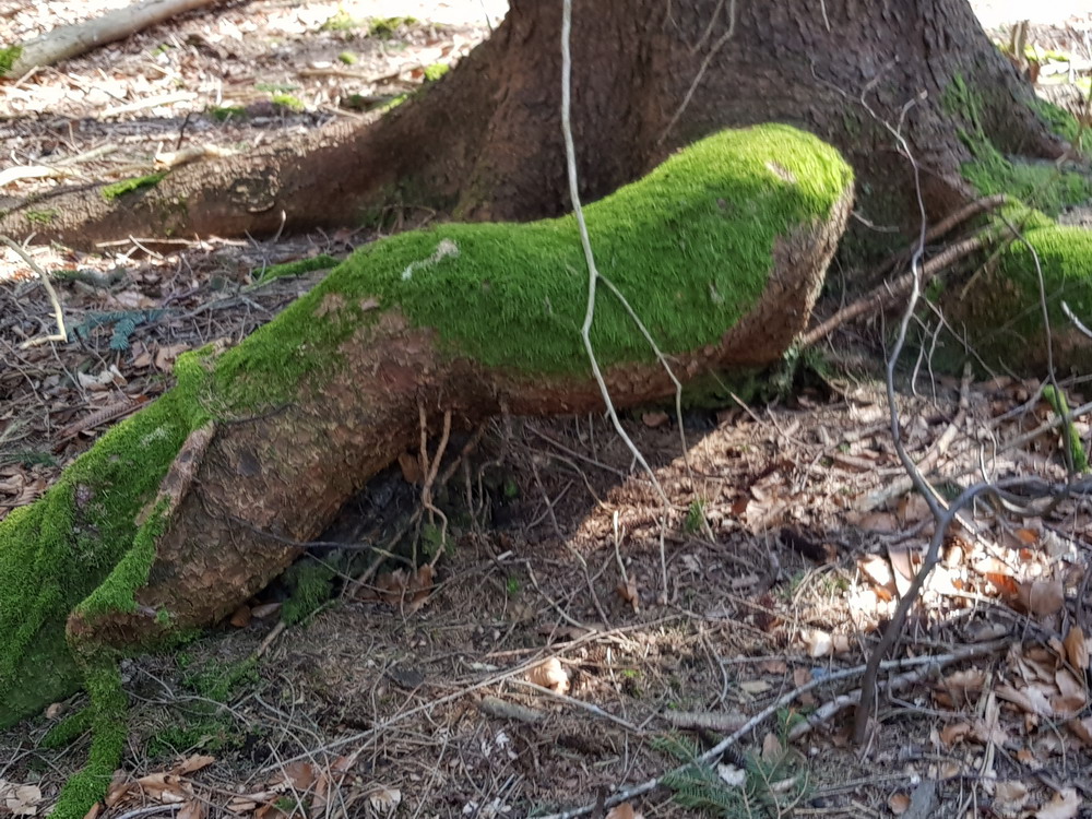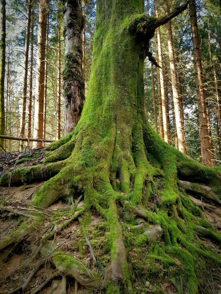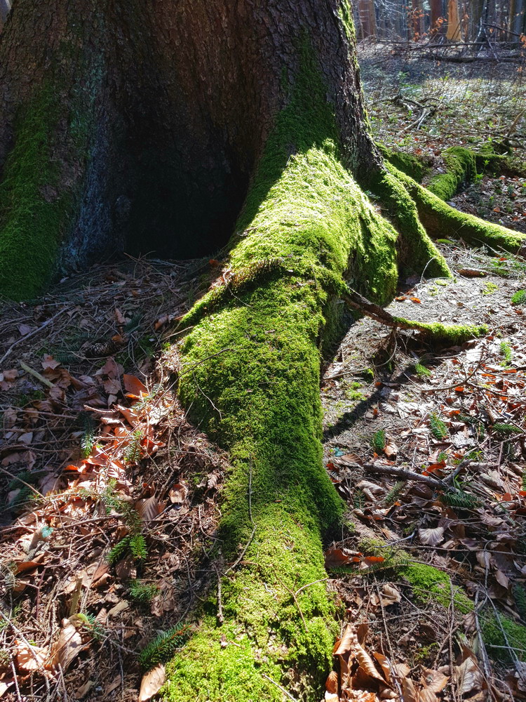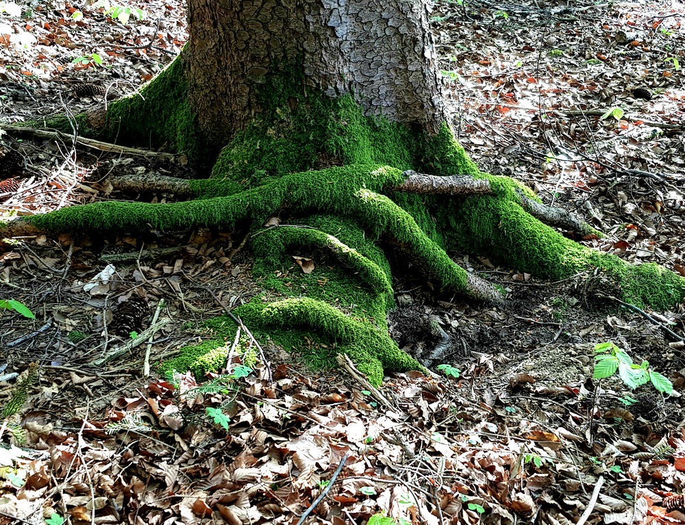 Da waren wir wieder unter unseren Freunden, den Bäumen!! Wir konnten die Stille genießen und vor allem die gesunde, heilsame Waldluft einatmen! Da sah ich sie wieder: „Die grünen Füße der Bäume“, das Moos an den Wurzeln der Bäume! Dieses wunderschöne Grün der Moose im Kontrast zu dem Braun oder Grau der Baumstämme!! Das musste ich einfach fotografisch festhalten!!